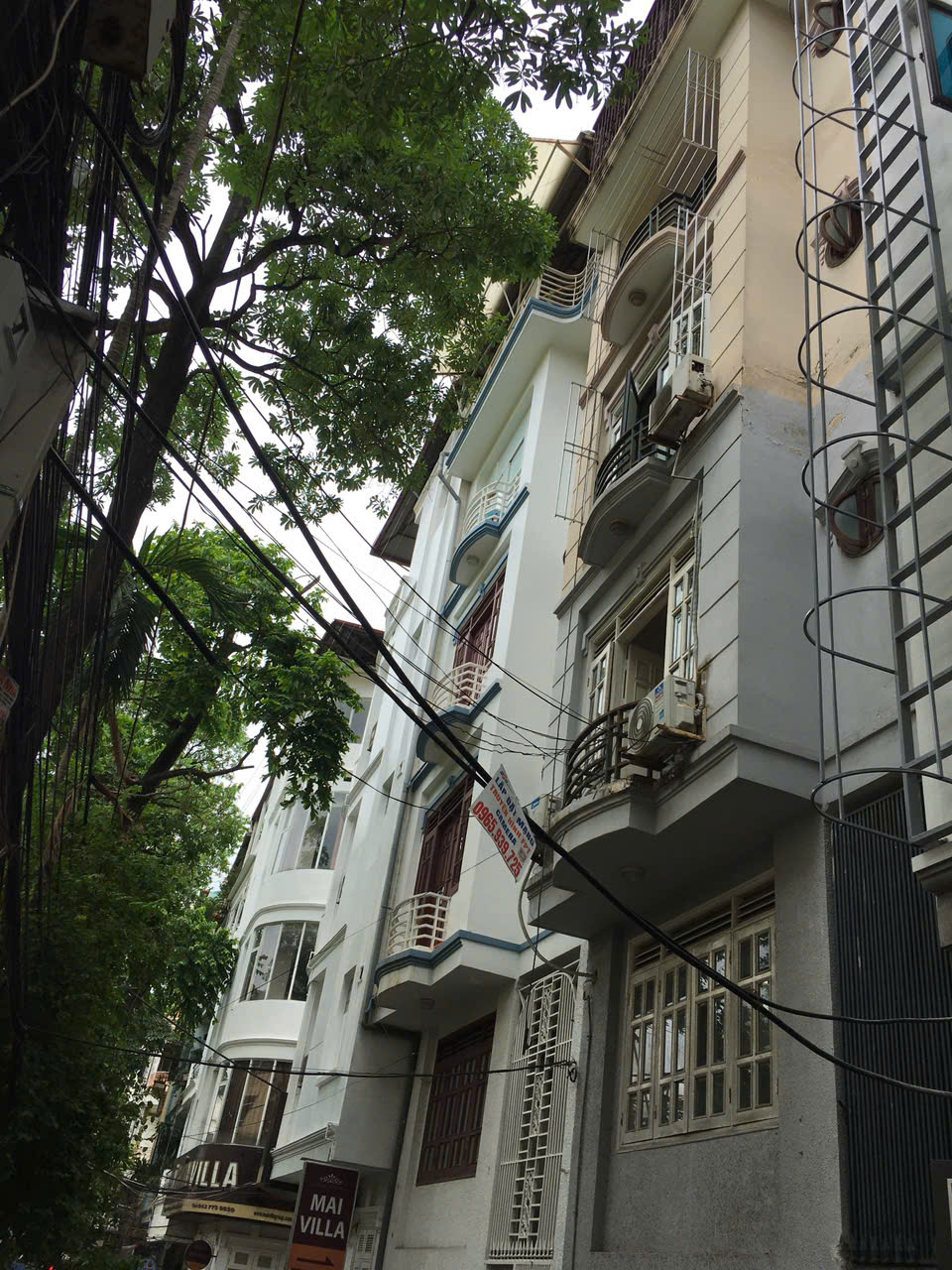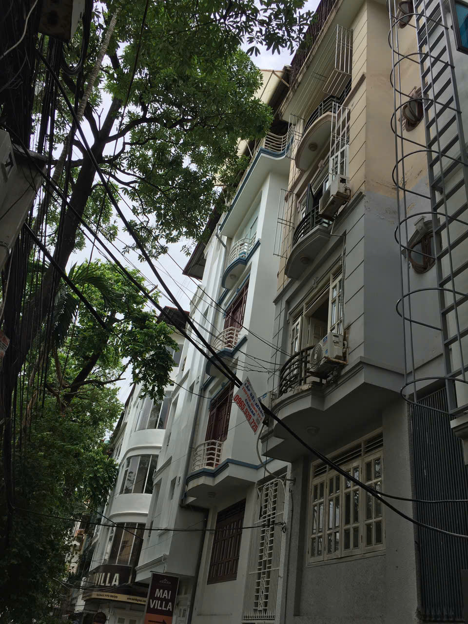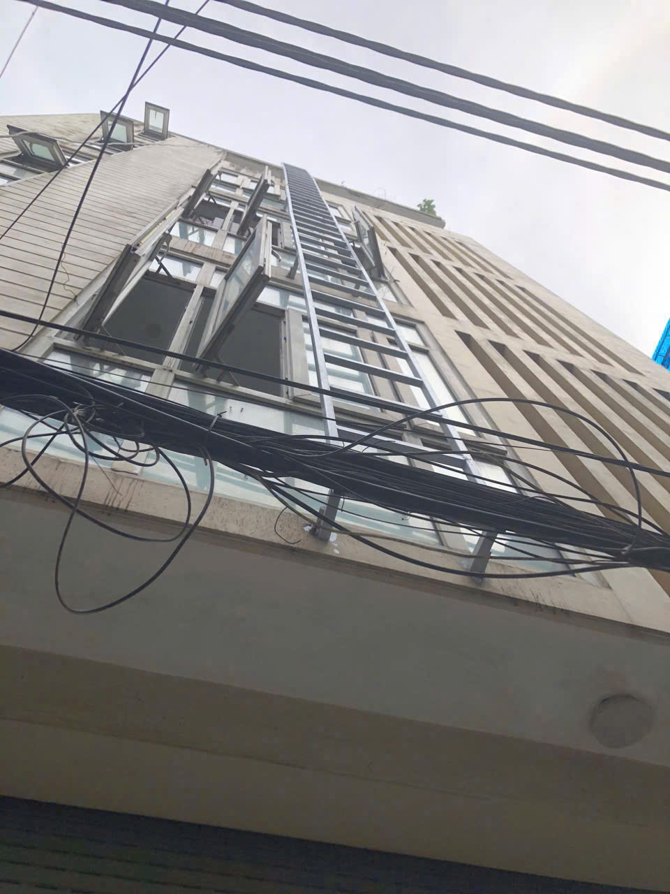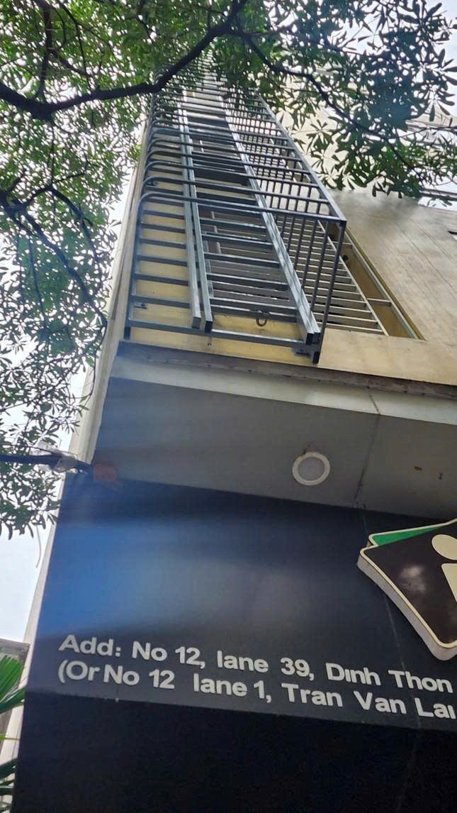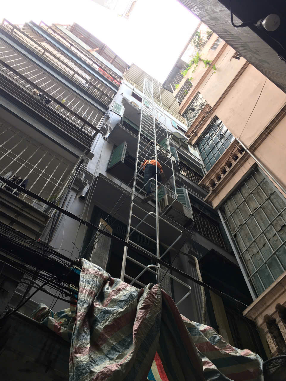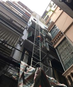 Thang đặt sát tường, cố định bằng các giá đỡ thép.